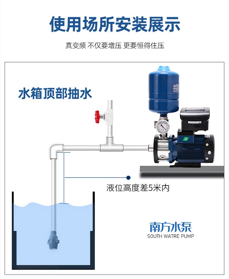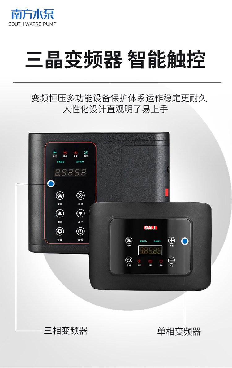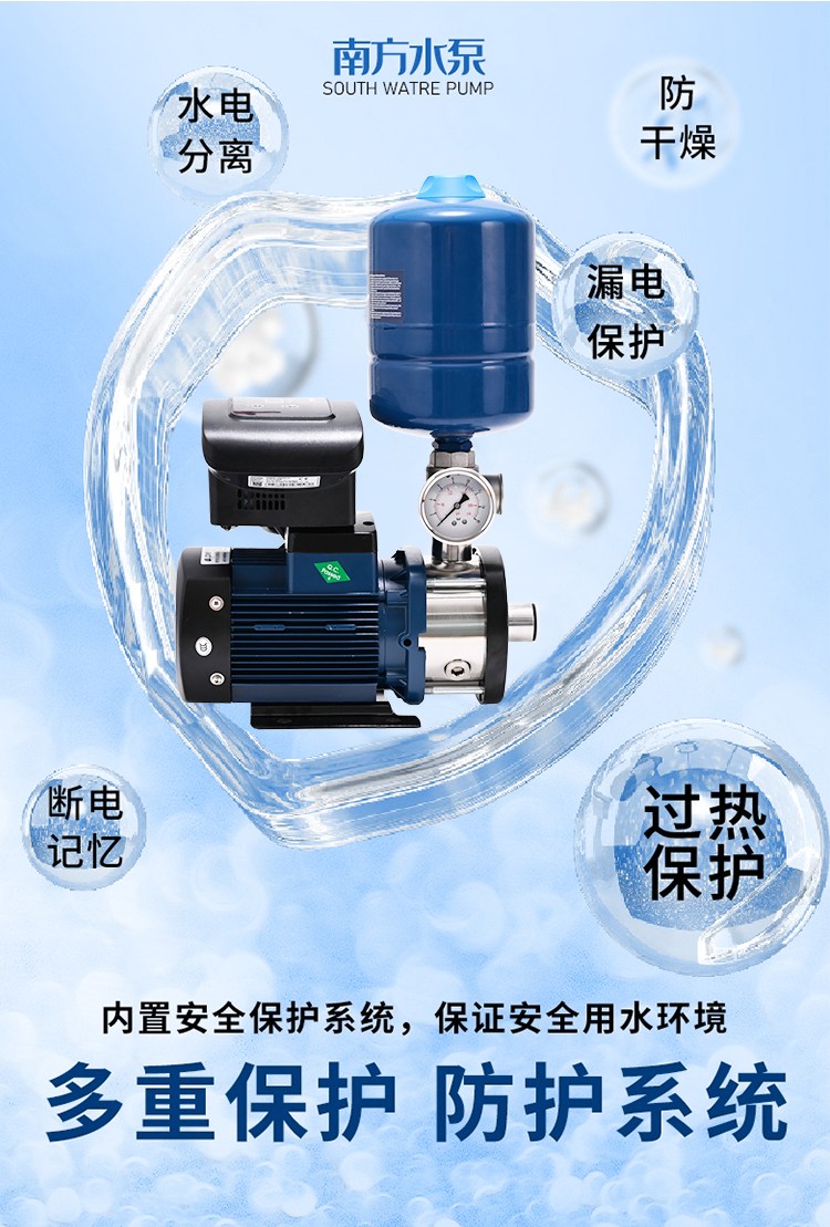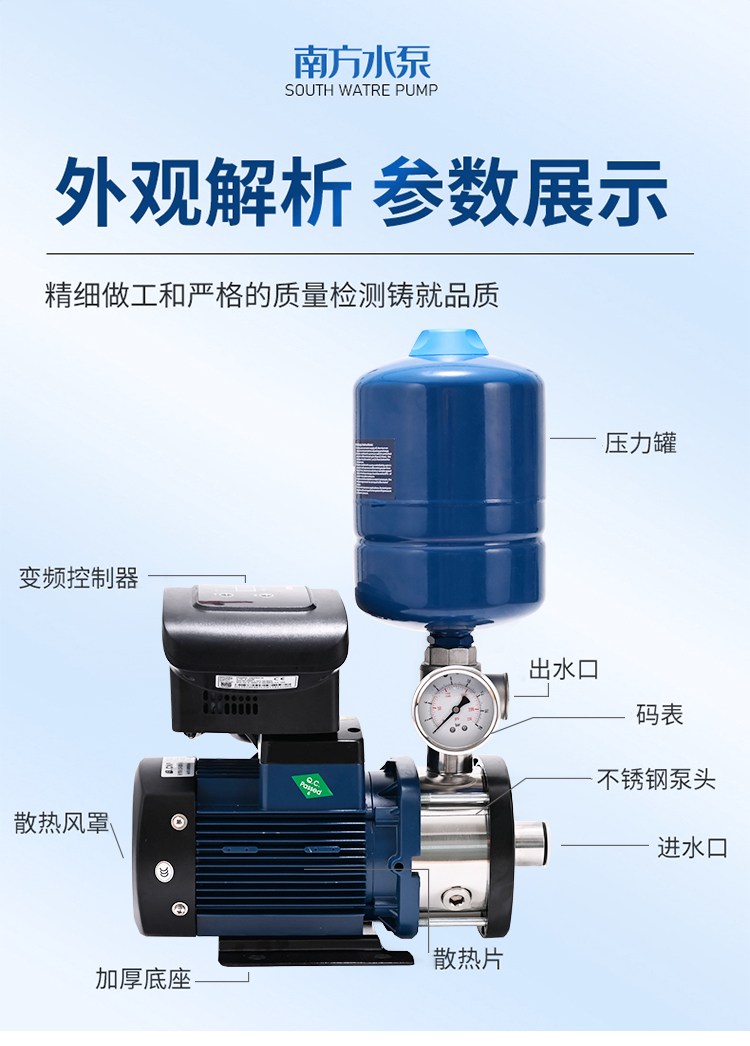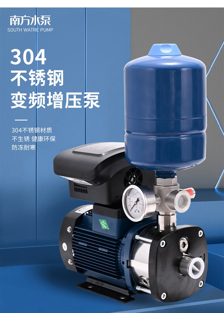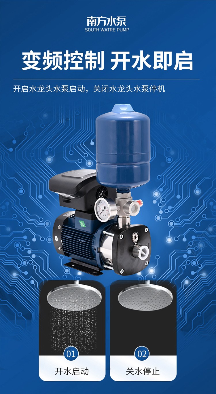 南方CHME系列臥式智能恒壓變頻泵采用了變頻調速及自動化控制相結合的技術,配合高效節(jié)能的CHM非自吸輕型臥式多級離心泵。整機主要由CHM泵、控制器、傳感器、壓力罐、五通止回閥及軸向抗震壓力表等組成。具有性能穩(wěn)定、高效節(jié)能、全自動智能控制、低噪音、耐腐蝕、結構緊湊、外形美觀、體積小、重量輕等特點。