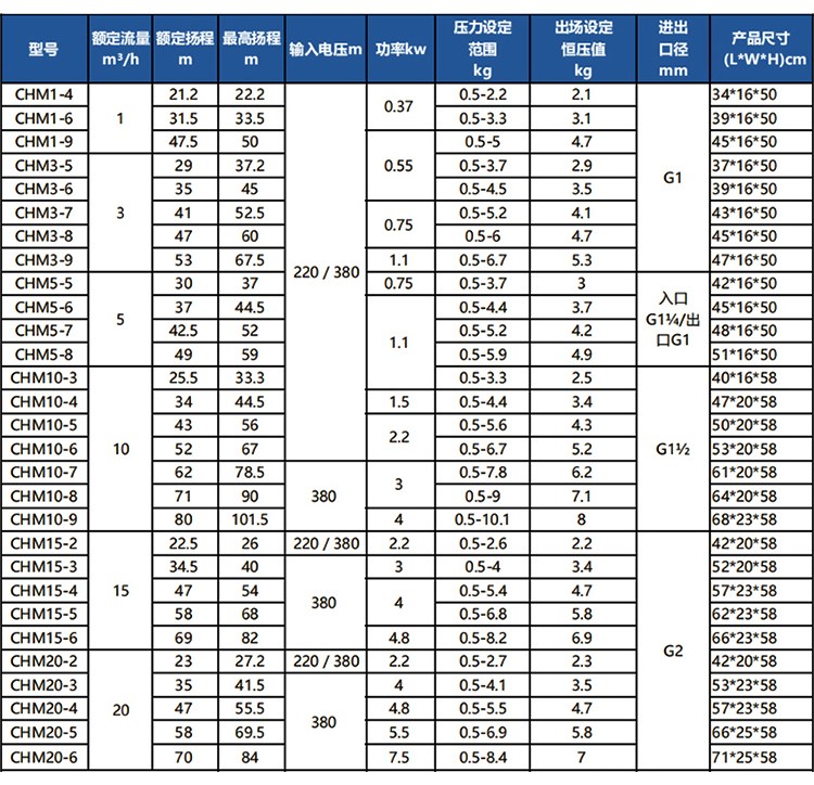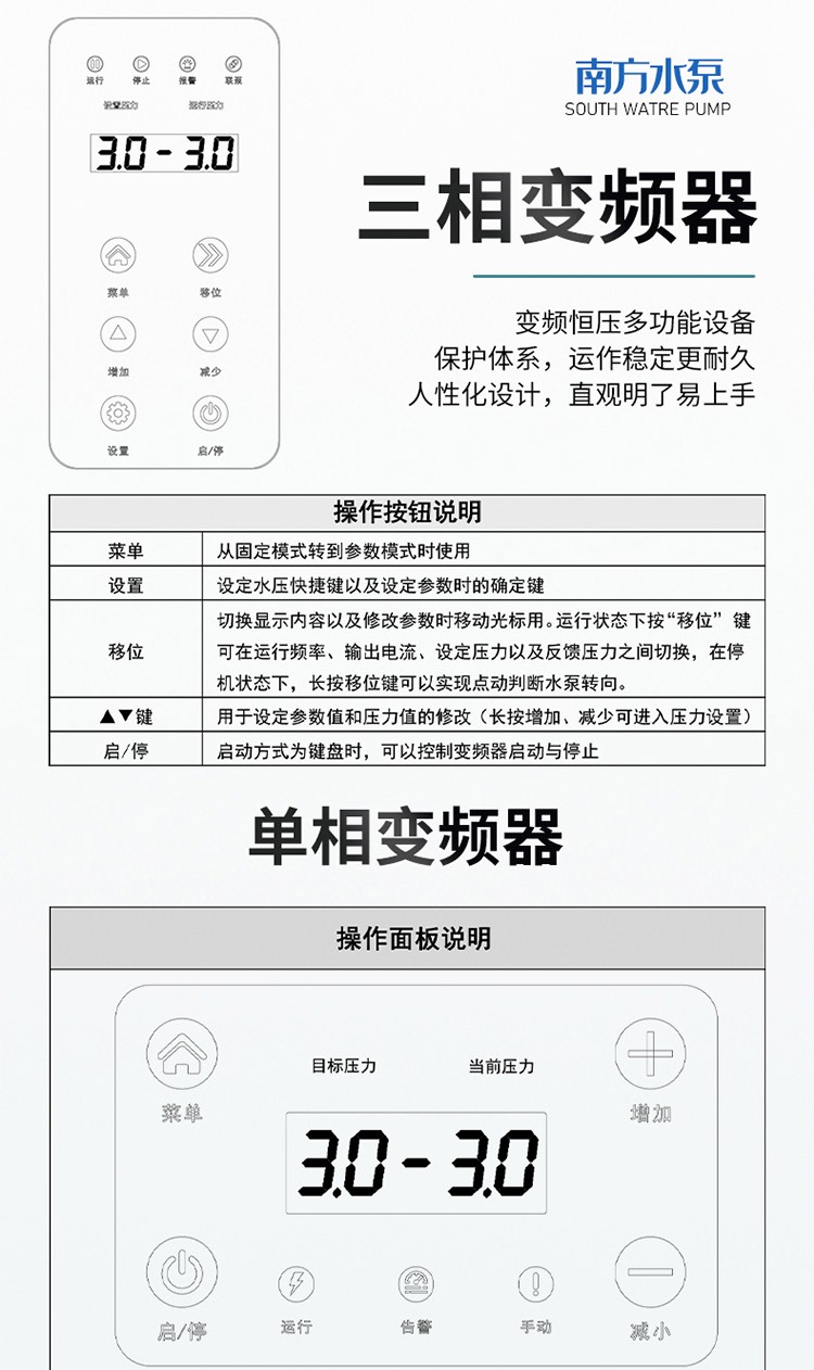 產品說明:南方chme系列臥式智能恒壓變頻泵采用了變頻調速及自動化控制相結合的技術,配合高效節(jié)能的chm非自吸輕型臥式多級離心泵。