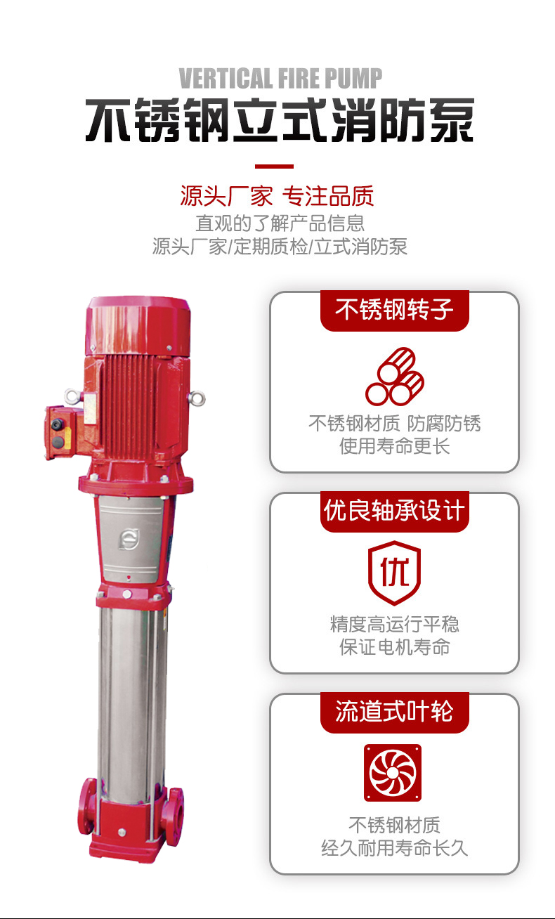 南方XBD非自吸立式多級(jí)消防泵組,電機(jī)軸通過(guò)聯(lián)軸器直接與泵軸聯(lián)接,葉輪導(dǎo)葉采用不銹鋼板沖壓焊接或不銹鋼精密鑄造制成,泵進(jìn)出水口在泵底同一直線(xiàn)上。